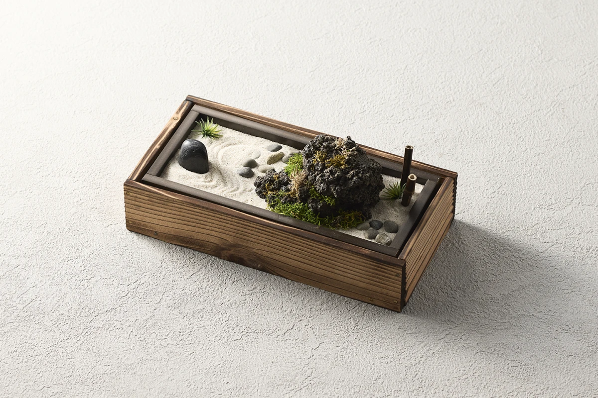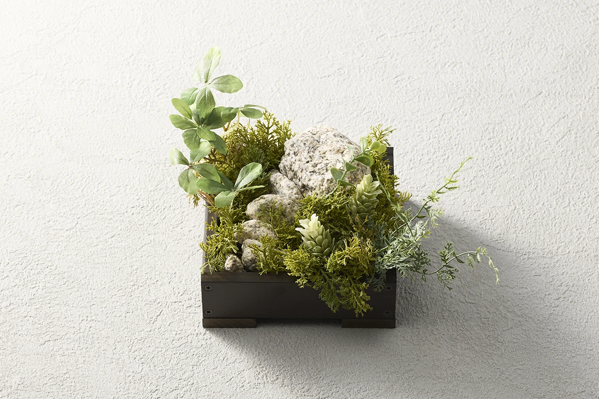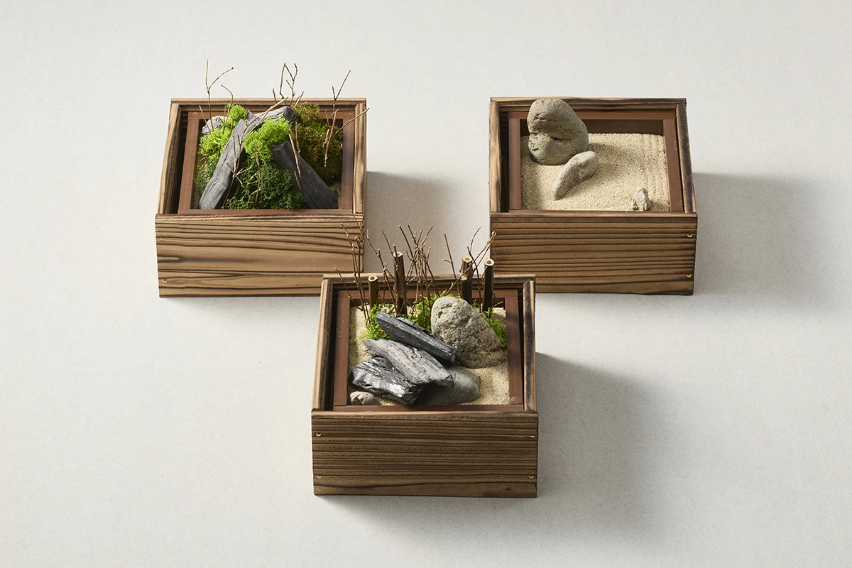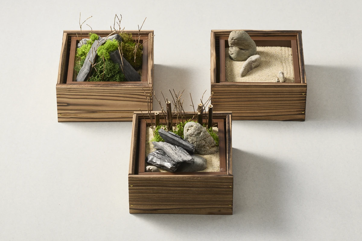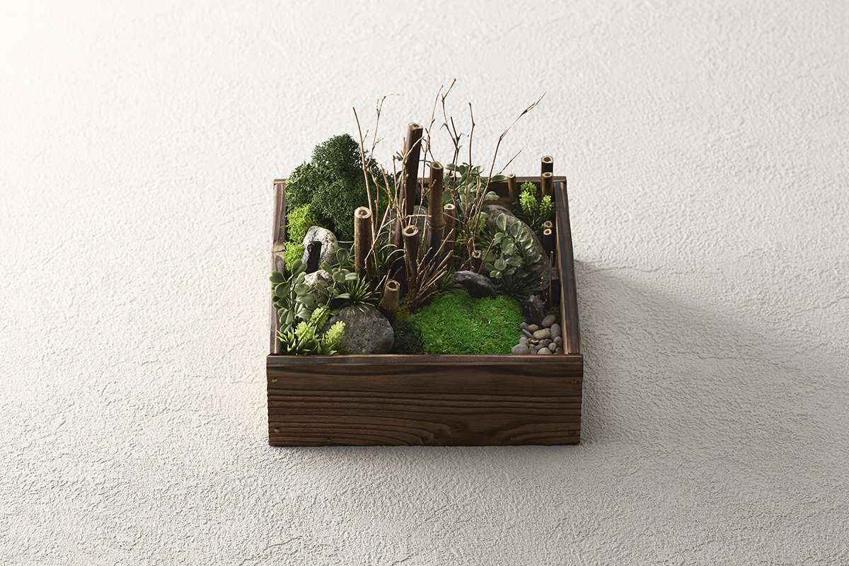 職人の手仕事によって一つひとつ丁寧に仕上げた、焼杉板の箱。熟練の技術を要する二面焼きの焼杉板は、耐久性・耐腐食性を高め、木目模様を引き立てています。美しい木目の焼杉板の中に、味わい深い素材を配置して小さな庭が完成いたします。