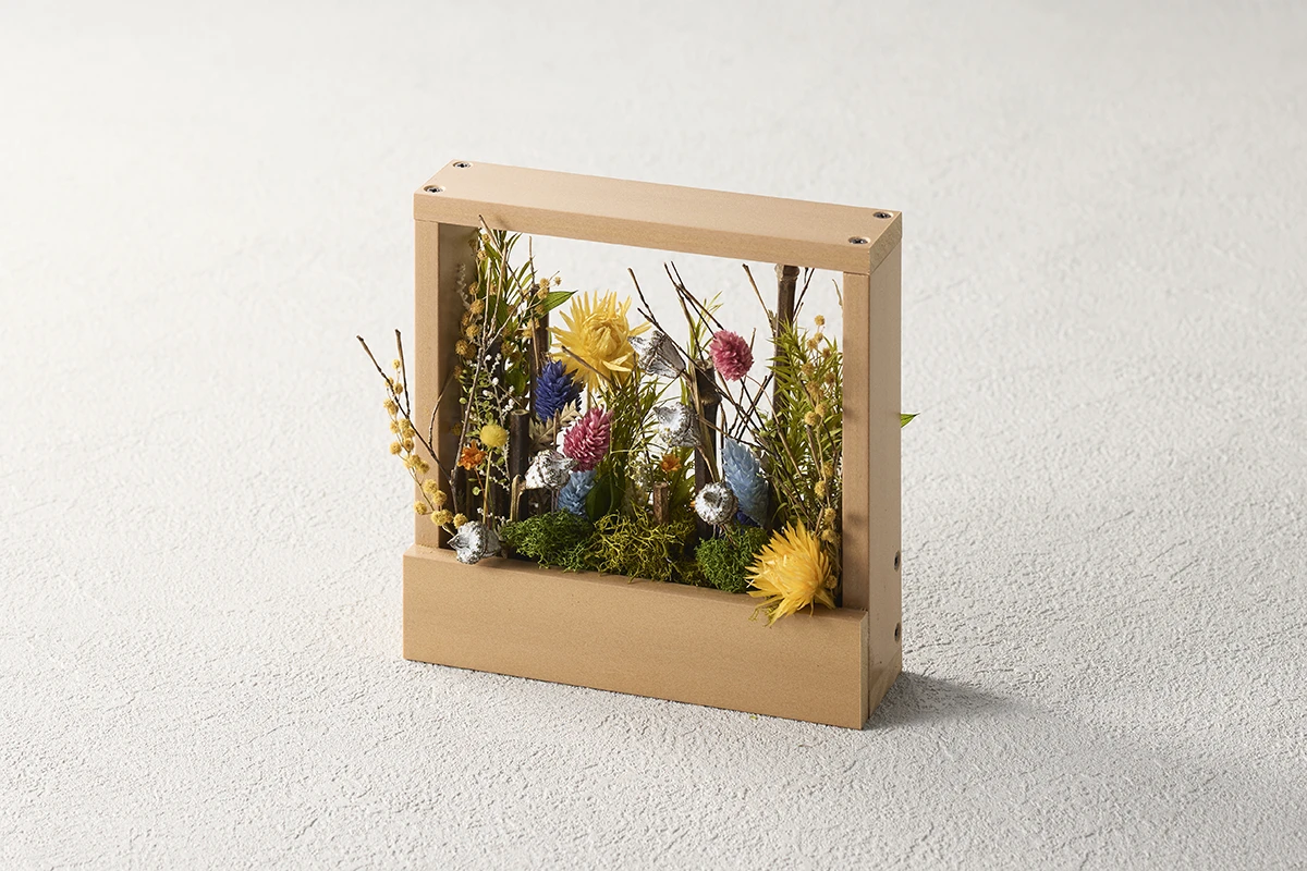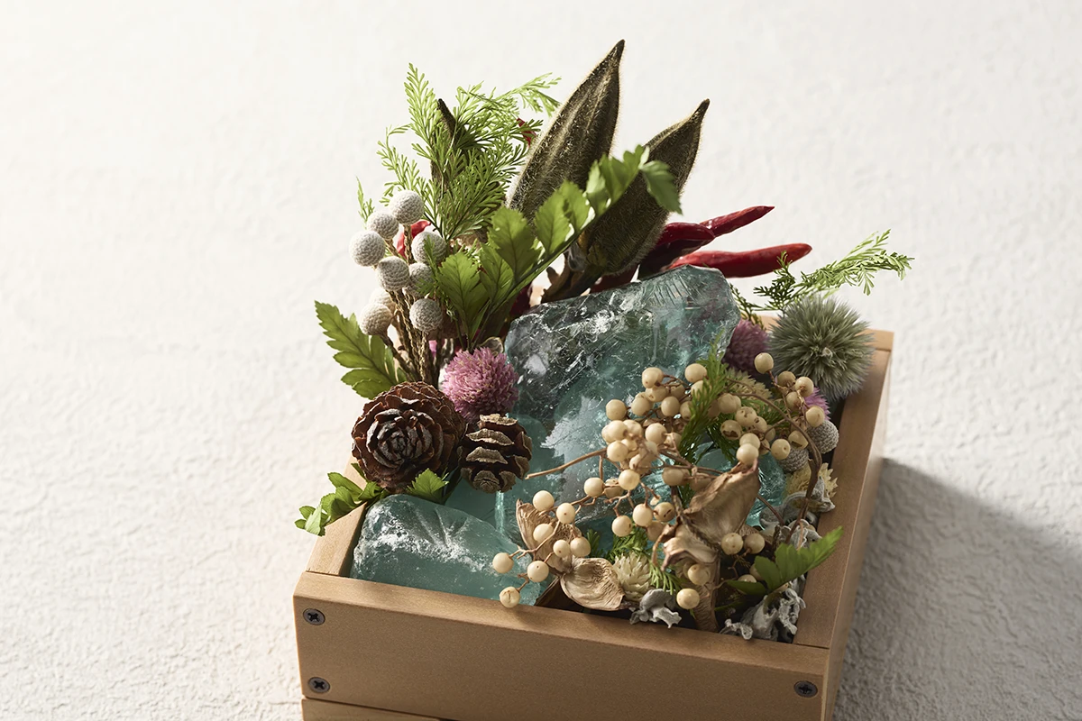 天然素材の⼿ざわりや⾹りを楽しみながら、自分だけの箱庭を仕上げていただけます。同じ箱庭でも、季節の移ろいや気分にあわせ表情を変えられることもJ.Makeの箱庭の醍醐味です。箱庭が仕上がっていく時間は、心を整え静かで穏やかなひとときに。