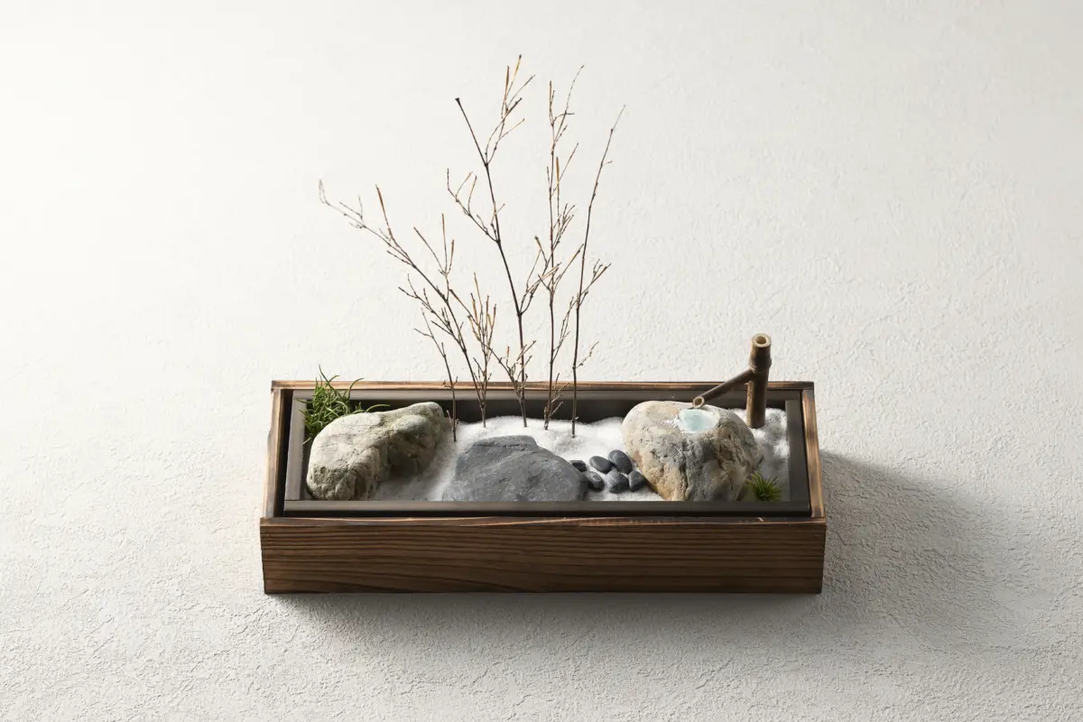 仕上がった箱庭は、和の趣きにも洋のモダンな雰囲気にも調和し、お店やオフィス空間にも自然になじみ、空間を引き立てます。